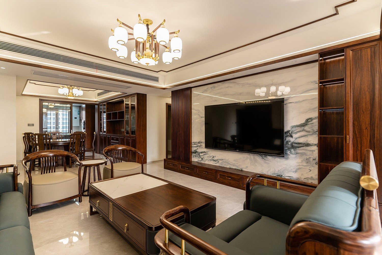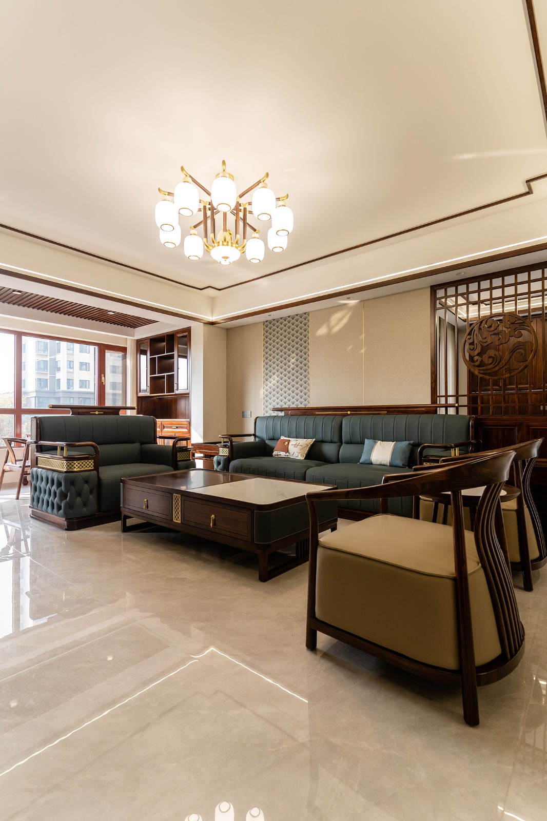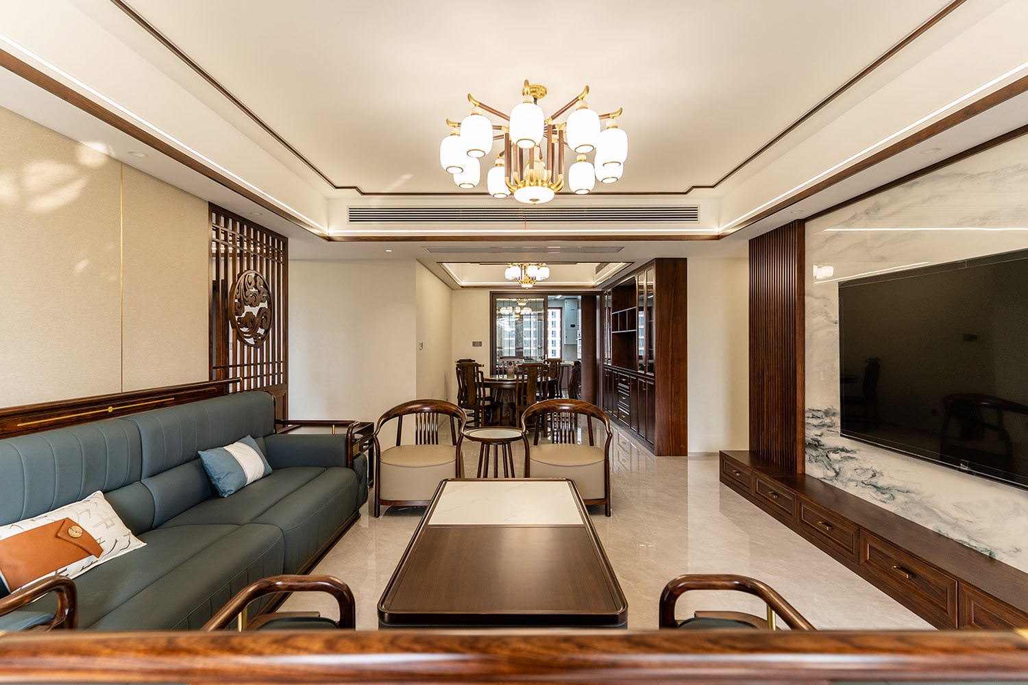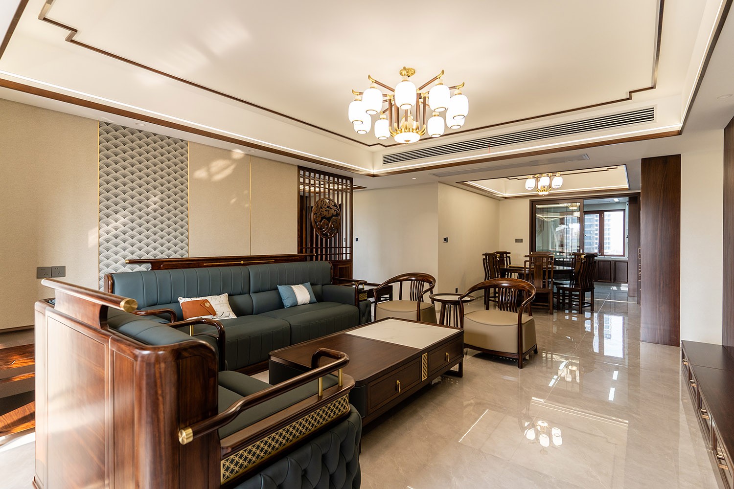 新中式風(fēng)格,是東方美學(xué)精神在現(xiàn)代語境下的華麗轉(zhuǎn)身與集大成者。在220平米的寬闊天地里,它得以超越符號化的堆砌,轉(zhuǎn)而通過宏大的空間敘事、深層的材質(zhì)對話與詩意的意境營造,打造一座兼具文化傳承、家族風(fēng)范與當(dāng)代舒適的傳世大宅。 本案的核心設(shè)計理念是 “大象無形,大音希聲” 。旨在以恢弘的空間尺度,承載最含蓄內(nèi)斂的東方意境。設(shè)計追求的不是形式的繁復(fù),而是空間氣場、文脈氣韻與生活氣息的完美融合。通過中軸對稱、虛實相生、框景借景等傳統(tǒng)造園手法,在現(xiàn)代大宅的框架內(nèi),營造出一種可供三代同堂觀想、品鑒與傳承的居住體驗。